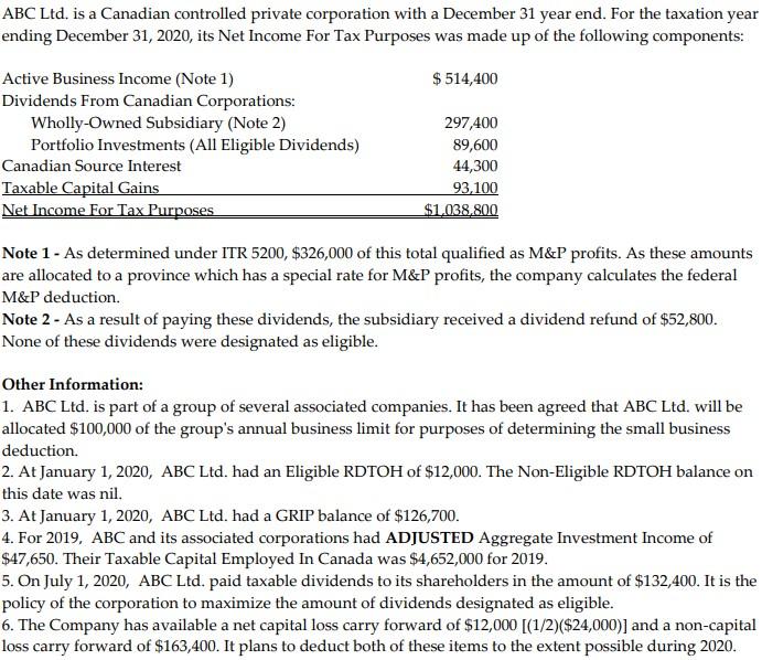 Abc Ltd Is A Canadian Controlled Private Corporation Chegg Com
